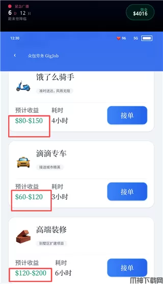 游戏中提供饿了么骑手、滴滴司机、装修等工作,每个工作的耗时不一,工作完成后将自动推进时间。