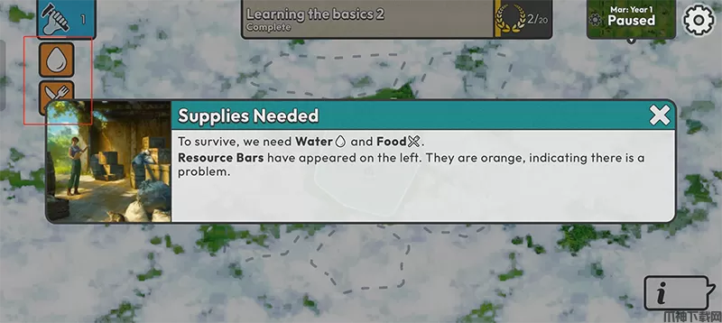 3、为了生存,我们需要水和食物。左侧出现了资源条。它们是橙色的,表示出现了问题。