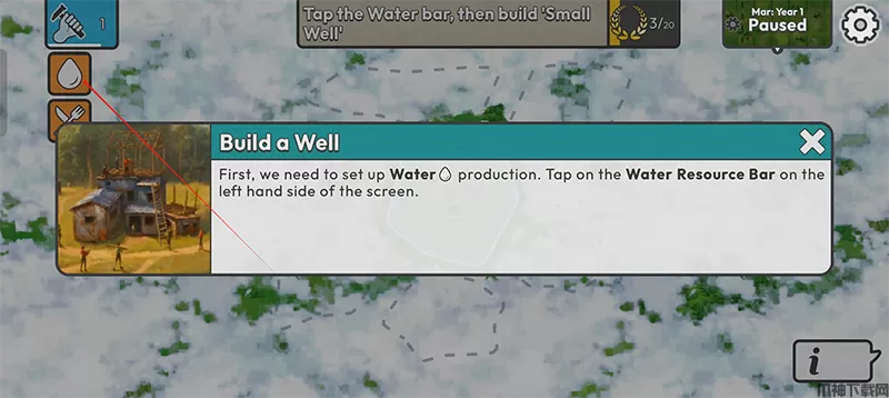 4、首先建造一口水井,点击屏幕左侧的水资源栏。