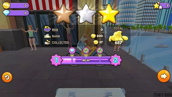 1、简单方便的游戏操作,只需要左右滑动来移动你的车手即可,出现特技按钮时点击即可完成特技表演。