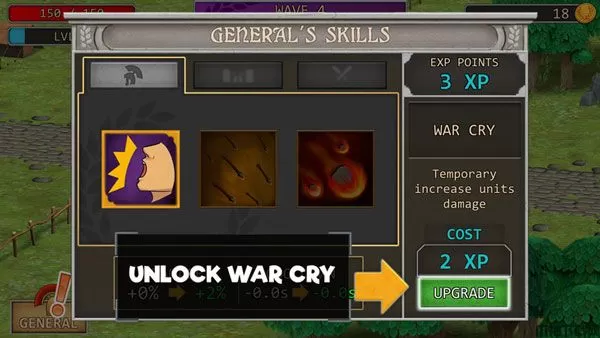 技能有多种,有提高士兵攻击力的,有提高对敌方城墙伤害的,有“火球术”等等,玩家可以根据自己的喜好来加点,不过“看不到”呢还是偏爱这个“WAR CRY”,它可以提高全体士兵的攻击力。