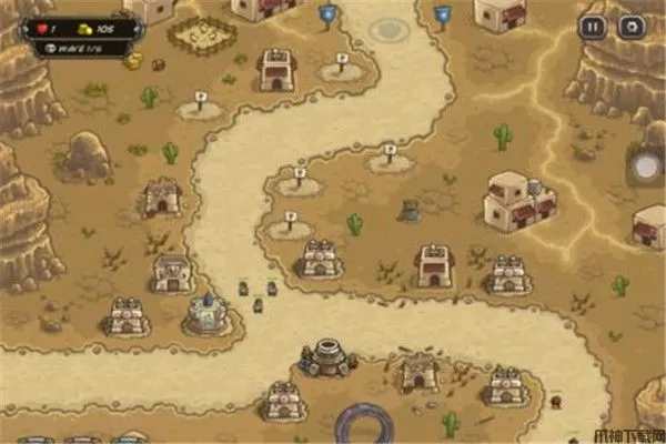 攻略:本关的重点在于死守中央路口,初始布局建议左侧弓箭塔,魔法塔;中下部弓箭塔,炸弹塔;右侧弓箭塔;中部步兵塔,弓箭塔(参考图片一)。有资金后在中部补充1座弓箭塔,1座步兵塔以稳固中央防守,增援还是冷却就用。然后升级,本关的塔可以升1级,优先升级中央的步兵塔,然后是左侧的魔法塔,再后是中央的弓箭塔和中下的炸弹塔。本关二级沙漠兵较多,在其于中央集中时用火雨。后期可酌情在后方补箭塔,总的来说本关难度不大,我通关时还有600多金