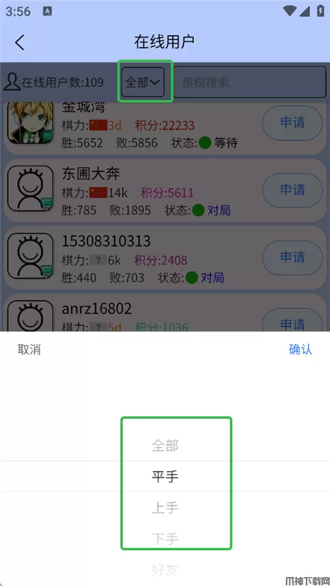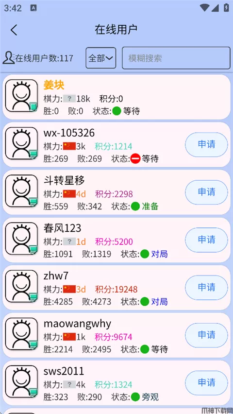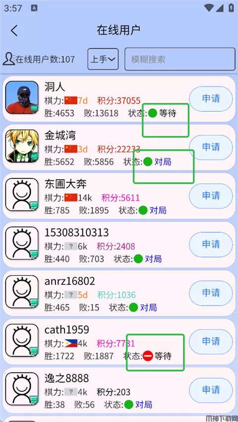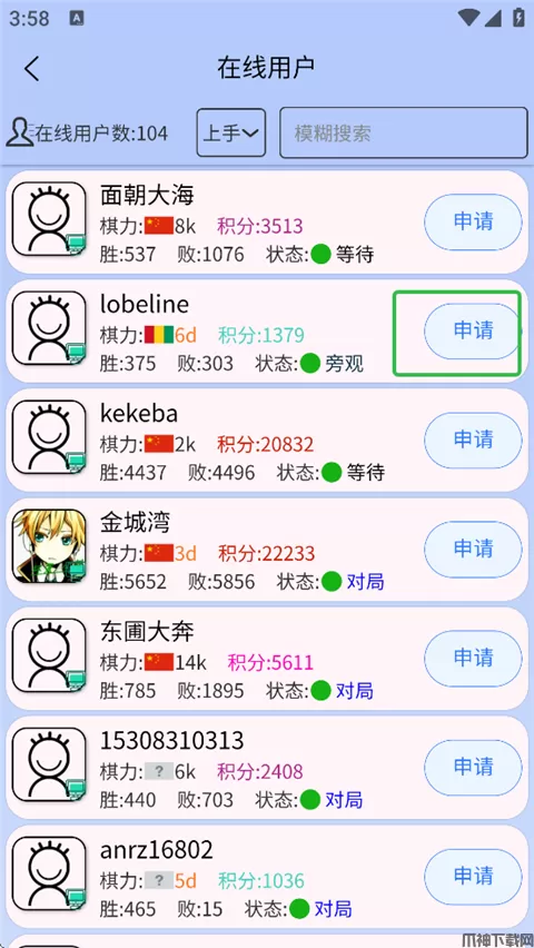4、挑选一个对手,点击【申请】,向他发起对局。