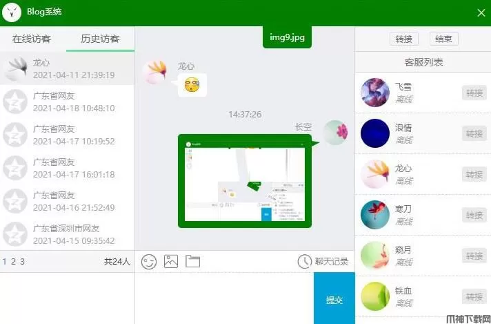特点: 支持分布式布署 支持本地消息存储 支持自动欢迎及常见问题分组展示 支持知识库个人或通用回复 支持自定义昵称、图像 支持自定义按钮、图标、样式 支持客服端接入 访客优先连接空闲客服等。