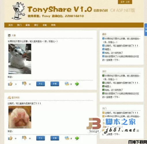 TonyShare仿糗事百科系统 asp.net版 v2.4 Access版 ,本系统是仿糗事百科主要功能,把所有文件上传到虚拟主机(asp.net版本需要.net framework 3.5)即可正常运行。