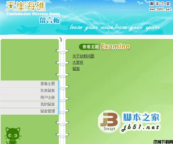 天涯海礁留言本 ,前台主要功能有:查看主题 发表留言 用户注册 我的留言 留言管理 后台有删除留言功能网页编辑器采用的是FreeTextBox