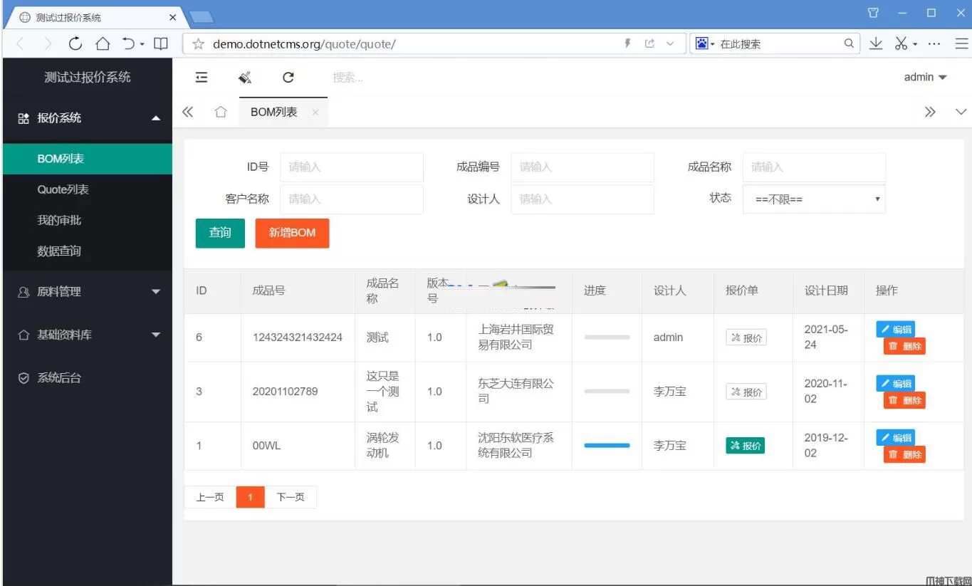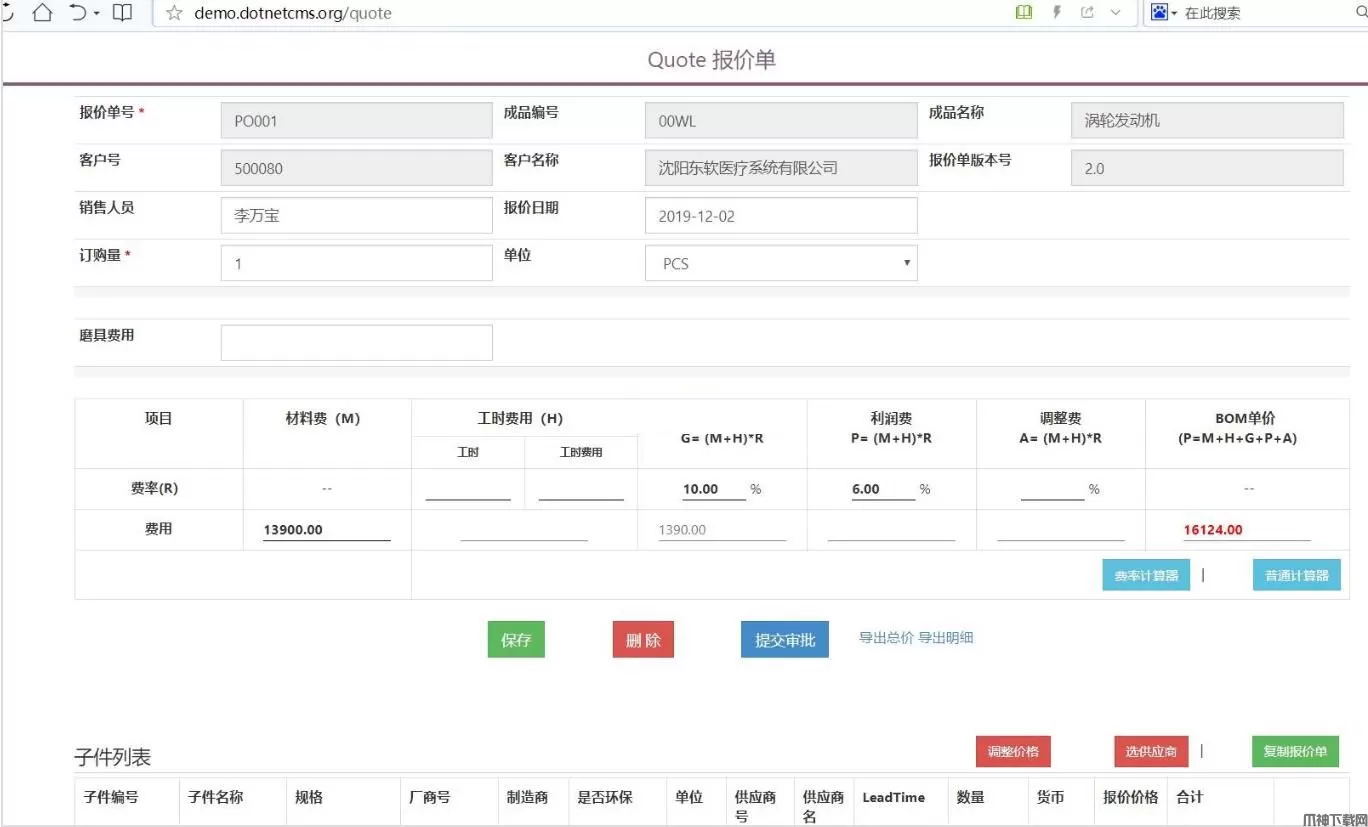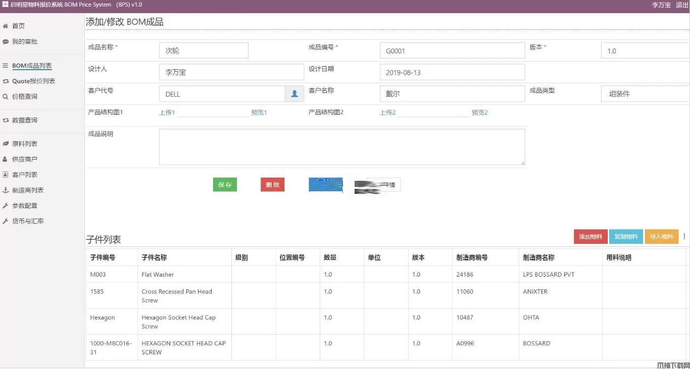 在一些制造型企业里,通常采用传统的来料加工工程。考虑下面一个场景: A公司是生产电脑商,其需要的键盘向B公司采购(我们称作A向B公司下单BOM,Bill of Material物料清单), B确定键盘需要的原料,部分原料自己生产,部分原料会向供应商C采购(C会给B一个报价单)。在B收到C的报价后, 再加上自己合理的利润,人工费,最终生成一个新的报价单Quote,返回给A客户。 由此建立了“客户-本公司-供应商”这种供应链生态圈。 传统B向A报价时仍采用Excel进行汇总,这种缺点包括 (1)无法跟踪BOM的变更。客户发的BOM清单并不会是一成不变,当BOM变更时,Excel无法跟踪这种变更。 (2)无法跟踪原料价格变更,例如同一个螺丝钉,不同供应商对原料报价不一样,应该择优录取,但是Excel无法跟踪这种变更。 (3)企业利润变更。作为制造型企业,需要加上一定的利润,人工费,机器损耗费等。当公司其中数据变更时,需要优化报价系统。 本系统就是为了解决BOM清单和Quote报价的问题而开发的