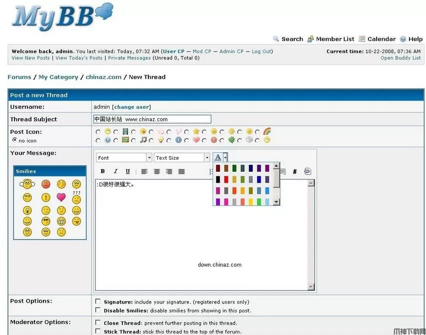 MyBB 强大的管理后台可以让您轻松定制论坛的每一个细节。通过 MyBB ,您可以轻松地改变论坛版块的属性,布局,结构等。比如说,您想让您的用户在XXX秒钟内最多只发一个帖子;再比如,您想让用户的签名显示在他们的帖子下方。您也可以很容易的在这里 MyCode 获取自定义代码添加到您的论坛上,这就和您在论坛上发表帖子一样方便。