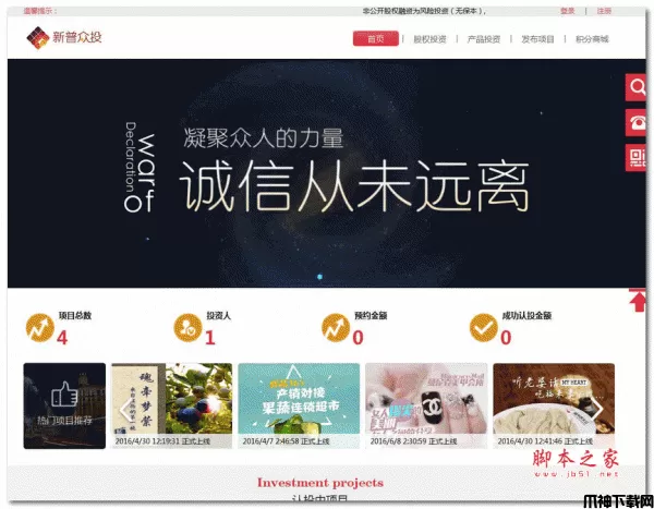 XpZC新普众筹系统是以asp.net mvc+sql进行开发的众筹网站源码。 新普众筹系统可以实现众筹平台的快速搭建,规范业务流程、项目募集资金、运营风险控制、资金支付结算、项目实施控制、投后管理,安全的软件系统架构和规范的项目风险控制体系,为投融资双方提供安全优质的服务,达成互利共赢。众筹类型可选择股权众筹和回报众筹;根据客户实际需求能灵活增加系统功能模块,致力于为项目人和投资人搭建一个安全、高效、稳定的网络服务平台。 新普众筹系统特点: 1、使用ASP.Net MVC、领域驱动设计模式 2、限制国内IP访问功能 3、MSSQL数据库 4、UTF-8编码,可用于全球的服务器 5、支持在线备份MSSQL数据库 6、拥有三大配套前端:PC前端+微信WEB端+APP 7、拥有伪静态技术 8、缓存技术加快网页浏览速度 9、前端广告位可灵活更换 10、资讯新闻展示功能强大,可根据使用者需要自由设置栏目 11、产品众筹与股权众筹可自由搭配 12、项目三重审核 13、支持项目评论功能 14、支持项目评分功能 15、项目上线时间,筹资时长可灵活调控 16、股权众筹融后管理功能强大,可上传分红报表以及财务报表 17、产品众筹可管理众筹订单。导入快递单号 18、支持线下充值功能 19、支持站内信以及系统消息模板编辑 20、拥有内置的积分制度 21、支持红包功能 22、拥有积分商城功能 23、人性化设置,可配置后台 24、三大前端有统一的后台数据管理。 25、可查看平台所有资金记录,随时监控资金动向。 26、项目统计,会员统计,图表分析 27、在线充值:现支持通联支付,先锋支付。 28、支持与各大众筹平台的项目推送对接。 29、前端设计风格高端,美观大方 30、扩展性好