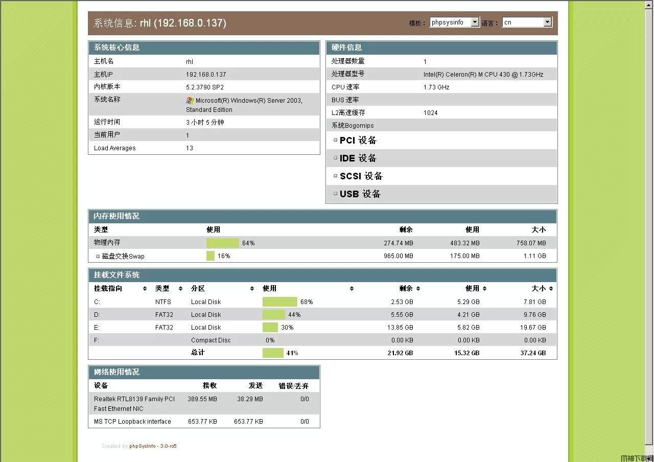 phpSysInfo v3.4.4 主机系统信息查看 多国语言版 ,phpSysInfo是基于apache和php,简单监测服务器状态,包括服务器使用的系统,核心版本,服务器硬件信息详细信息,同时还有网络设备的使用情况,以及内存的使用情况,磁盘信息等,在页面最顶端可以选择页面的风格以及语言.