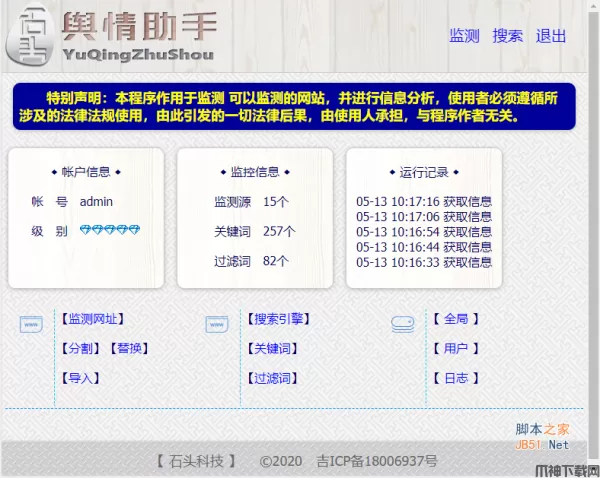 石头科技 - 舆情分析小助手可以循环监测,第一时间采集指定网站公开发布的信息标题,并依据关键词、过滤词 筛选出用户所需的信息及链接,并提示使用人员。方便新闻舆情管理人员尽早做出反应。由于操作简单、体积超小,等原因,该程序受到了大量用户的喜爱,6年过去了,石头科技没有停止更新,真诚希望本程序能为开发者,提供更便捷的操作环境。欢迎需要的需要此款舆情分析系统的朋友前来下载使用。