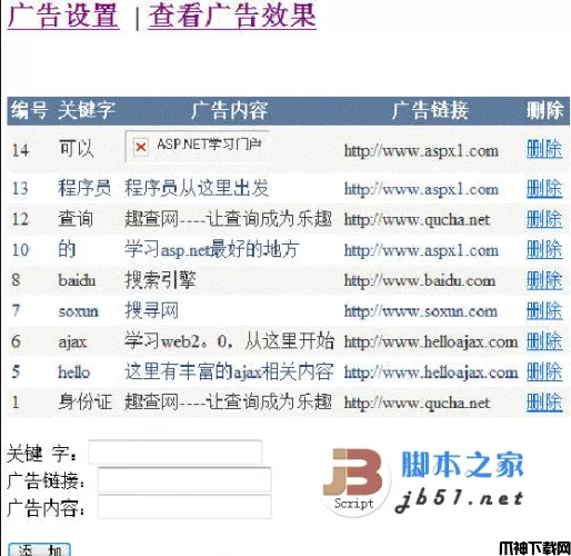 内文广告系统源码 1.1:本系统的用户分为:网站主、广告主、管理员3种。与之相对应的,广告系统也可以分为3部分:网站主的用户中心、广告主的用户中心和系统的核心部分。 内文广告,也称为文章链接式广告,即将文章内容中出现的关键词自动生成广告链接,当鼠标放在关键词链接上即出现广告窗体。这种广告的投放位置位于网页中心,投放效果和投放位置都非常好。 内文广告的实质是把网页中指定关键字替换为带弹出“气泡”的超链接形式,当鼠标划过关键字时,广告(“气泡”)自动弹出。所以内文广告系统的核心数据是广告关键字和具体广告内容。 管理登录:login.aspx 账号:aspx1 密码:aspx1