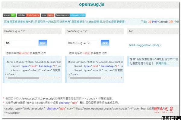 百度搜索框提示免费代码配置调试程序。 openSug.js旨在帮助站长、开发者只需引用一段JS即可获得带有“搜索框提示”功能的搜索框,让搜索变得更便捷!