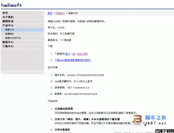 海狸CMS是一款操作简单,功能强大的网站管理系统。 英文名:HCMS 运行环境 操作系统:Window XP/Vista/2000/2003/2008 web服务器软件:IIS 5.0及以上版本 语言框架:.NET Framework 2.0 数据库:access/sqlserver/mysql/oracle 产品优势 支持网站群管理 可实现树型结构的多站点管理,站点之间数据可以互相调用(避免了数据孤岛)。 支持文件(网页、图片、视频)分布式部署到多个服务器 访问压力将被负载到不同服务器,而且可通过文件服务器追加解决数据无限膨胀的存储问题。 支持多数据库 支持主流数据库(access,sqlserver,mysql,oracle),满足用户不同需求,网站群内可不同数据库混用。 顶尖的模板功能 编译式的模板引擎,实现任意方式排版,模板制作简单。 主界面地址 admin/index.html 管理员账号 10001 管理员默认密码 hailisoft