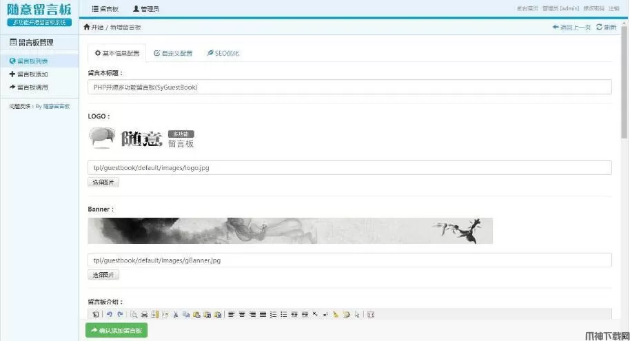 5、每个留言板支持自定义导航、自定义LOGO图片、Banner图片、SEO优化