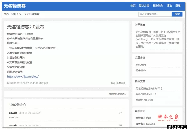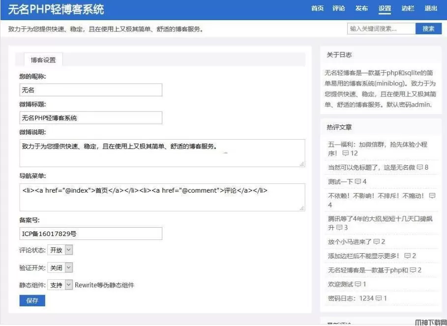 无名轻博客是一款基于php和sqlite的简单易用的个人博客系统(miniblog)。致力于为您提供快速、稳定,且在使用上又极其简单、舒适的博客服务。