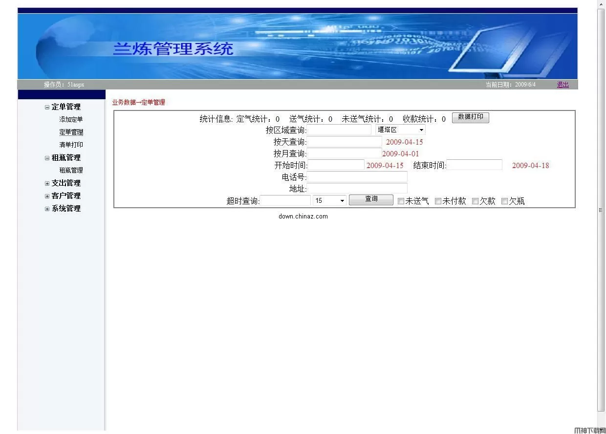 4.租瓶管理提供了租瓶信息和退瓶信息的添加和删除. 5.支出管理 6.删除规则1)定单信息可以任意删除,不建议---这些都是您的基础数据,有利于您采取一些商业策略和活动.2)删除客户信息,必须先删除与他有关的所有定单3)删除员工,必须先删除他的支出信息4)删除客户类型和客户区域信息必须先删除所有的客户信息