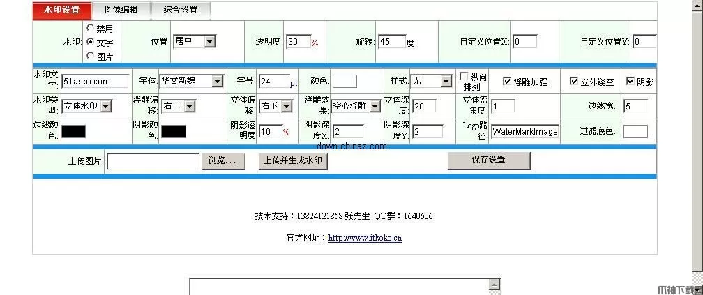 .NET 缩略图水印组件,ImageWaterMark3.0缩略图水印组件是基于Asp.Net2.0 C#.Net WebForm而开发的全功能组件,无需再服务器端安装AspJpeg组件,它的技术特点目前版本新增加了透明浮雕功能、水印平铺等,目前也是国内唯一支持透明浮雕的处理。功能介绍文字水印、Logo水印、文字水印