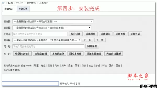 01、安装本插件之后,可以输入新闻资讯的网址或者关键词、一键批量采集任何新闻资讯的内容到您的论坛版块或者门户栏目、群组发布。