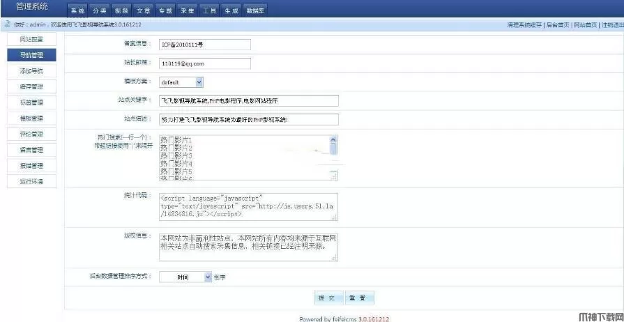 FeiFeiCms 飞飞影视导航系统 v4.3.201206,飞飞影视导航系统(FeiFeiCms)是一套专为不同需求的站长而设计的视频点播、聚合导航系统,灵活,方便,采集快是最大的特色,为初学者快速架设网站首选,只需5分钟即可建立一个海量的视频讯息的行业网站