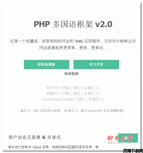 PHP多国语言轻量级框架 v2.0,这是一个轻量级,底层架构的网站和 Web 应用程序。它的设计能够让你网站搭建起来更简单,更快,更高效