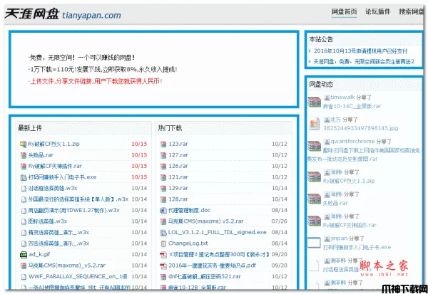 特点: 1、免费,无限空间!还是一个可以赚钱的网盘! 2、插件和dz论坛完美结合,附件外链永久有效; 3、上传至天涯网盘的文件永久保存; 4、提供快速、稳定的下载服务; 网站文件存储在天涯网盘,不仅为您节省了空间和带宽,还为您提供每千次下载不低于11元的现金计划!绝不扣一分的量,公司诚信经营!满20元既可以提现!