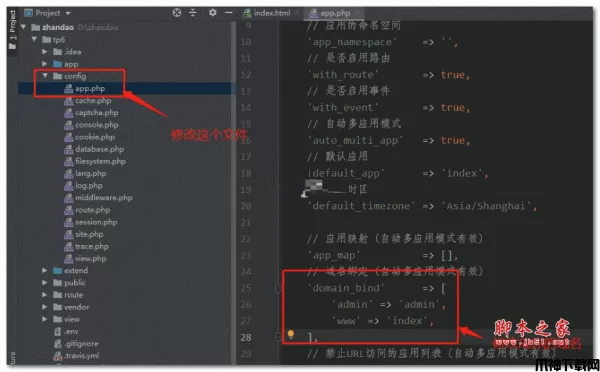 本程序采用前后台分离的方法,本地请创建admin.XXXX.com后台地址(xxxx.com代表你的域名),创建www.xxxx.com域名,修改根目录下config文件夹下app.php文件中的domain_bind属性,如软件截图中,将你解析的域名前缀写上去,如你的后台域名前缀为admin123,将图中admin(本地后台前缀)修改为admin123。