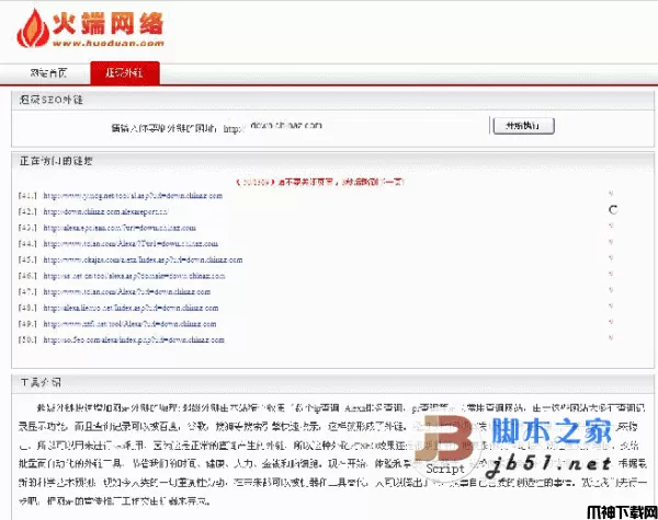 超级外链快速增加网站外链的原理: 超级外链由本站精心收集了数个ip查询 Alexa排名查询,pr查询等站长常用查询网站,由于这些网站大多有查询记录显示功能,而且查询记录可以被百度,谷歌,搜狗等搜索引擎快速收录,这样就形成了外链。 经过长时间观察发现这种外链有很大一部分还是比较稳定,所以可以用来进行seo利用,因为这是正常的查询产生的外链,所以这种外链对SEO效果还是很明显的!把复杂的友情链接交换过程交给电脑,交给批量而自动化的外链工具,节省我们的时间、健康、人力、金钱和脑细胞。现在开始,体验和享受功能强大、轻松便捷而免费的网站推广过程吧。根据最新的科学艺术预测:现如今人类的一切重复性劳动,在未来都可以被机器和工具替代,人可以腾出手来,从事自己喜爱的创造性的事情。就让我们先行一步吧,把网站的宣传推广工作交由机器来完成。 添加修改网址请修改url.txt文件,一行一个,要查询的域名用***代替。该程序不基本上不占什么服务器资源,多人在线刷也OK,在虚拟主机上使用也很好。