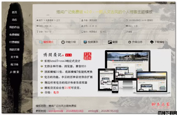 wordpress人文古风主题 php版 v2.5,博闻广记wordpress古风主题模板免费版是基于html5+css3制作的,她是一款高端大气、古典优雅的主题,采用响应式设计,两栏布局,上中下构造,兼容IE8、9、10、11和各种现代浏览器