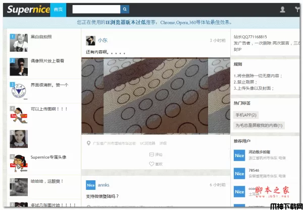 Supernice轻型社交圈 php版 v1.5,程序使用php+mysql编写,字符编码为UTF-8,前端采用HTML5编写,默认兼容IE10、CHROME、safari等浏览器,低版本浏览器无法使用本程序