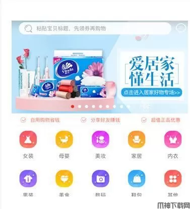9.9包邮:显示所有9.9包邮商品列表展示 淘抢购:优惠商品列表展示 0元购:新人专享,免单0元购 聚划算:划算商品列表展示 赚钱计划:链接到级别收益说明页面 天猫超市:跳转天猫超市页面 天猫国际:跳转到天猫国际页面 今日推荐:跳转到淘宝每日爆款页面推荐每日最IN商品 抖券:用刷抖音的形式买买买