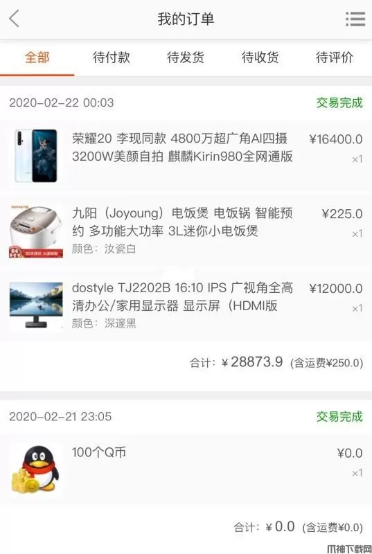 12、支持订单管理,可直接查看各种状态的订单(待付款,待发货,已发货,交易完成,交易关闭)