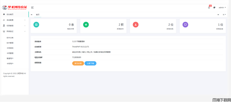 梦亚网络验证PHP开源源码,梦亚网络验证,基于thinkphp6.0+Bootstrap开发而成!后台管理系统是梦亚开发而成,非常不错,喜欢的朋友快来下载体验吧