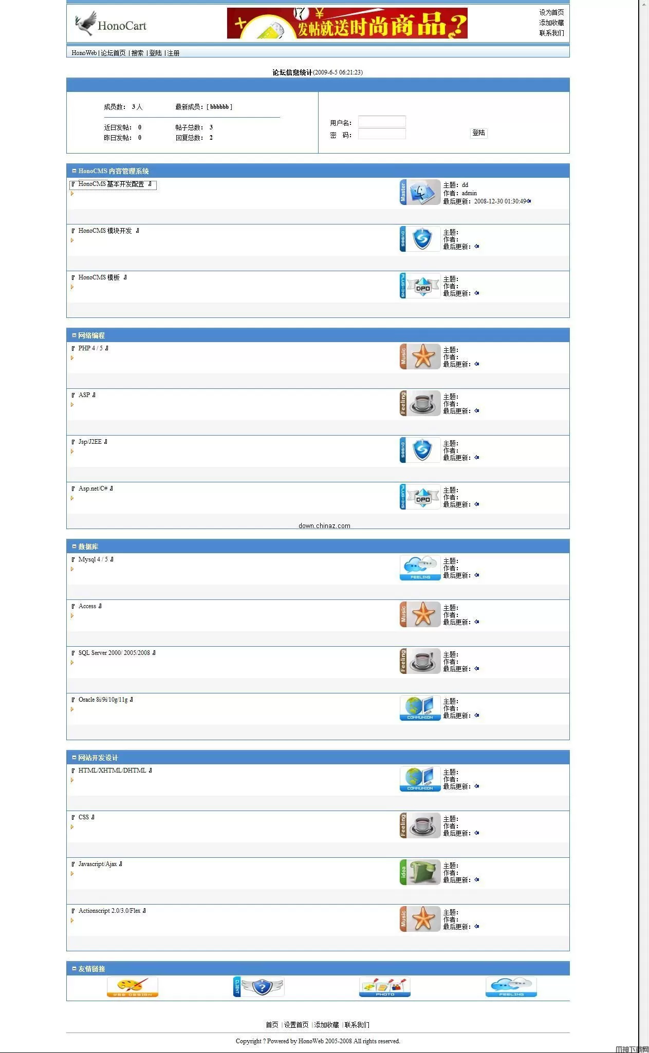 HonoBBS php论坛系统 v1.0,HonoBBS 是php/mysql 开发的内容管理系统1.动态网页管理 2.菜单管理3.角色组管理 4.用户管理5.权限管理 6.菜单栏目管理7.版主管理 8.论坛板块管理9.友情链接 10.论坛主题管理11.论坛回复 12.皮肤管理15.模块管理 16.数据备份