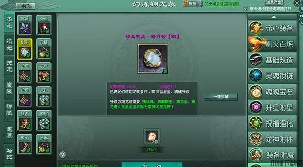 2、装备进行翔龙装炼化时,玩家需要先拆解升级装备的战魂,麒麟玉、龙星、龙槽,可通过一键拆解完成。