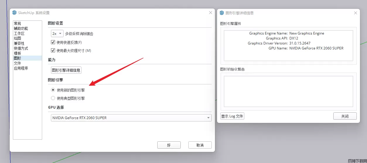 全新的图形引擎让大模型浏览更加丝滑!Sketchup2024版本带来了全新的图形引擎,可以让大模型浏览运行操作更丝滑!在系统设置中不仅可以查看图形引擎详细信息,还可以切换显卡。官方测试表明渲染帧数提高了8倍。如果硬件不兼容的情况下可以切换会以前的图形引擎版本。