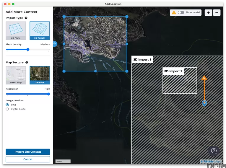 SketchUp 2024新增一个全新的“添加位置”插件,支持更精确的地形数据导入。该插件使用True north offset和定位针设置模型的地理位置。