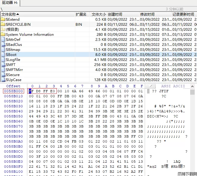 首先我们在系统H盘存放一个cat.jpg的图片文件,通过WinHex挂载该磁盘驱动器,如下图所示文件浏览窗口红色框中就是该cat.jpg文件,通过十六进制查看器,该文件存放的位置对应偏移地址为0058B000,其中jpg图片格式文件头对应的十六进制码为FFD8FF,如图中十六进制查看器的红色框中所示就是该cat.jpg文件头,后面的十六进制数就对应该cat.jpg文件。