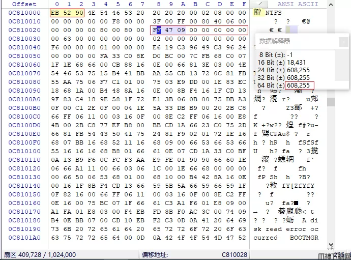 跳转至第409,728扇区,该扇区头部发现DBR标志EB 52 90,验证了我们计算的扇区大小的正确性,如下图所示,查看该dbr的28至2f保存的是文件系统扇区总数,通过数据解释器查看该分区扇区总数为608,255,这里使用当前扇区409,728加上608,255再加上1得到结果1,017,984,第1,017,984扇区已经非常接近磁盘总扇区数1024000,通过WinHex查看后续也没有DBR了,则可验证该磁盘有两个分区。
